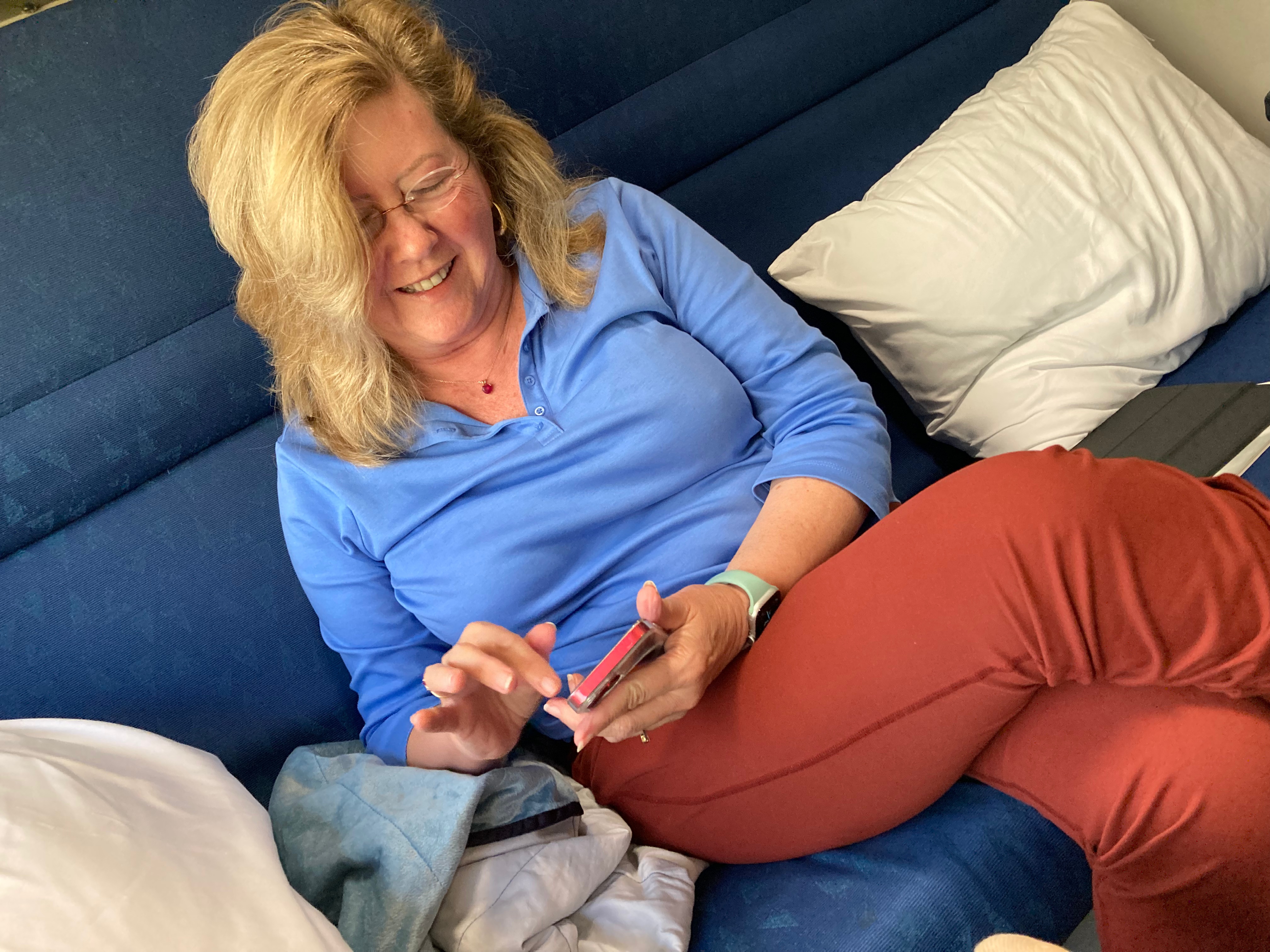 Previous ImageNext Image Texting in the bedoom Jeffee relaxes on the couch. Blond woman reads her phone while in the bedroom on the train.