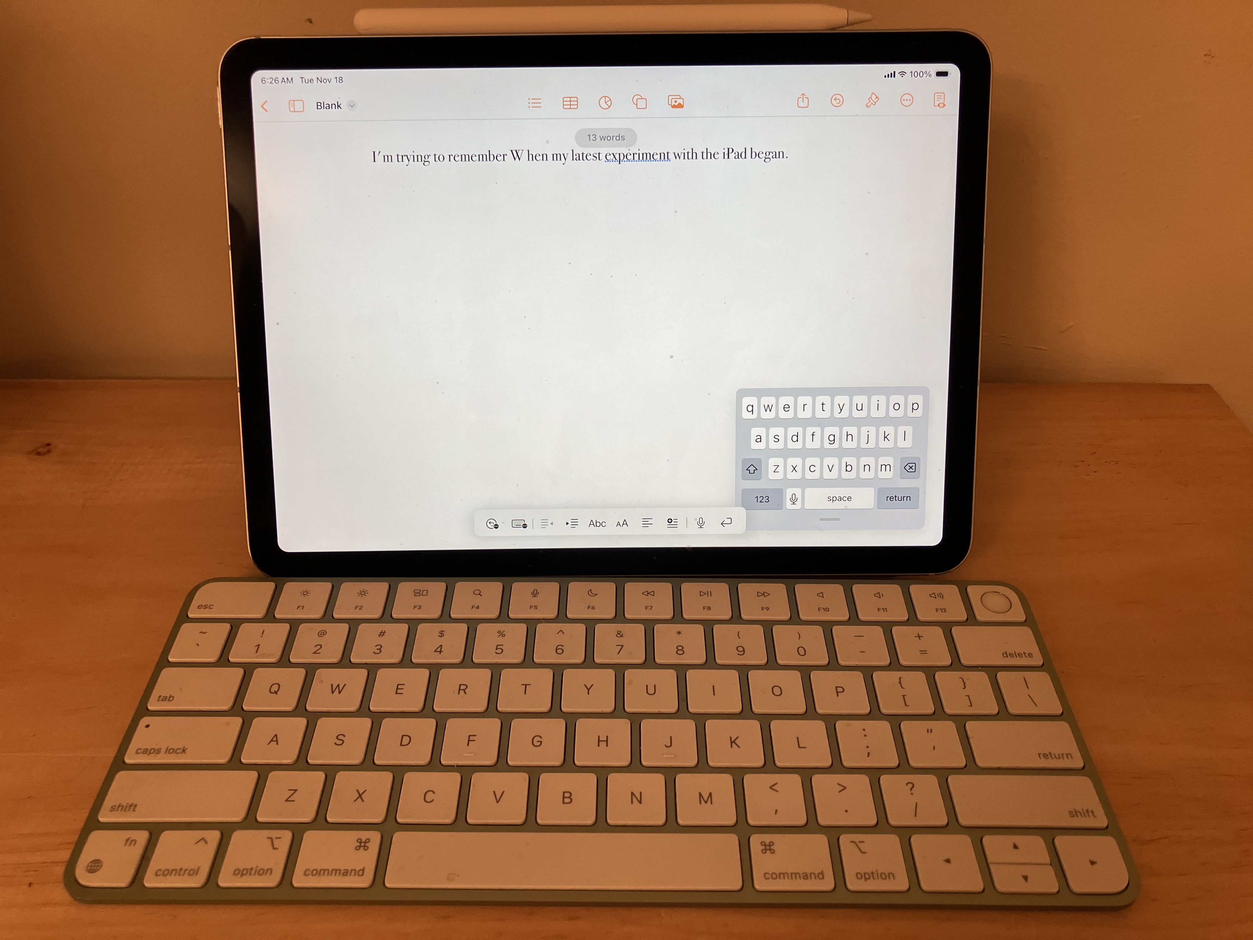 Previous ImageNext Image iPad Air You need a keyboard to enter text into the iPad. iPad with Pencil docked and keyboard sitting in front.